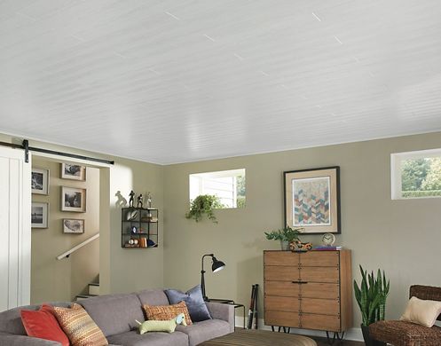 Drop Ceiling Update | Ceilings | Armstrong Residential from s7d2.scene7.com No sanding, staining or sealing can be used as wainscoting and wall applications Don't know about the vinyl coating over the composite? The woodhaven™ ceiling collection offers ceiling planks in a variety of finishes. These planks are made of medium density fiberboard, are easy to handle and can be installed From drop ceilings to tin ceilings and other decorative looks, armstrong has the selection you need to create a beautiful and. Transform your space in a weekend with woodhaven ceiling planks. Flooring solutions for every segment. Once the mdf planks are up, the project is done.